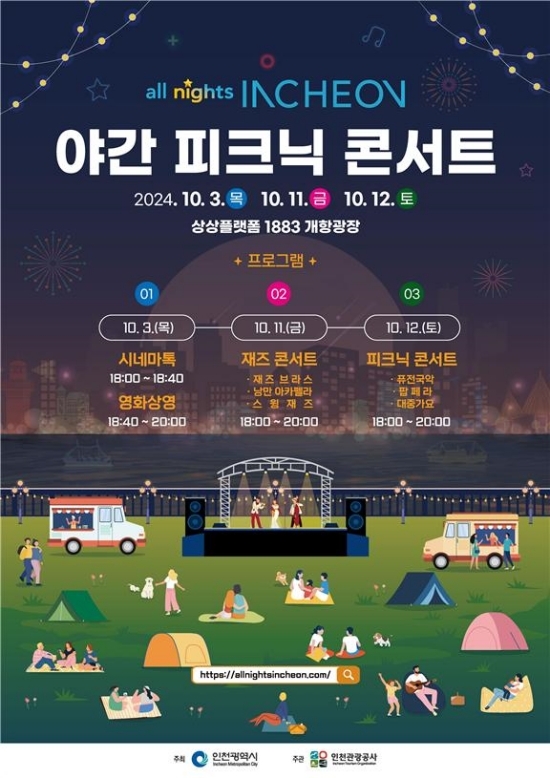 특히 ‘all nights INCHEON 야간 피크닉 콘서트’는 10월 3일, 11일·12일 총 3일간 인천 상상플랫폼 1883 개항광장에서 오후 6시~8시까지 진행된다.