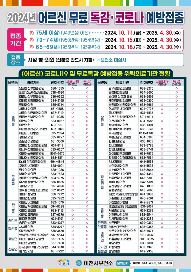 이달 15일부터 14세~64세 이천 시민 중 취약계층(장애인, 국가유공자, 기초생활수급자, 만성질환자)을 대상으로 보건소에서 인플루엔자 예방접종을 실시한다.