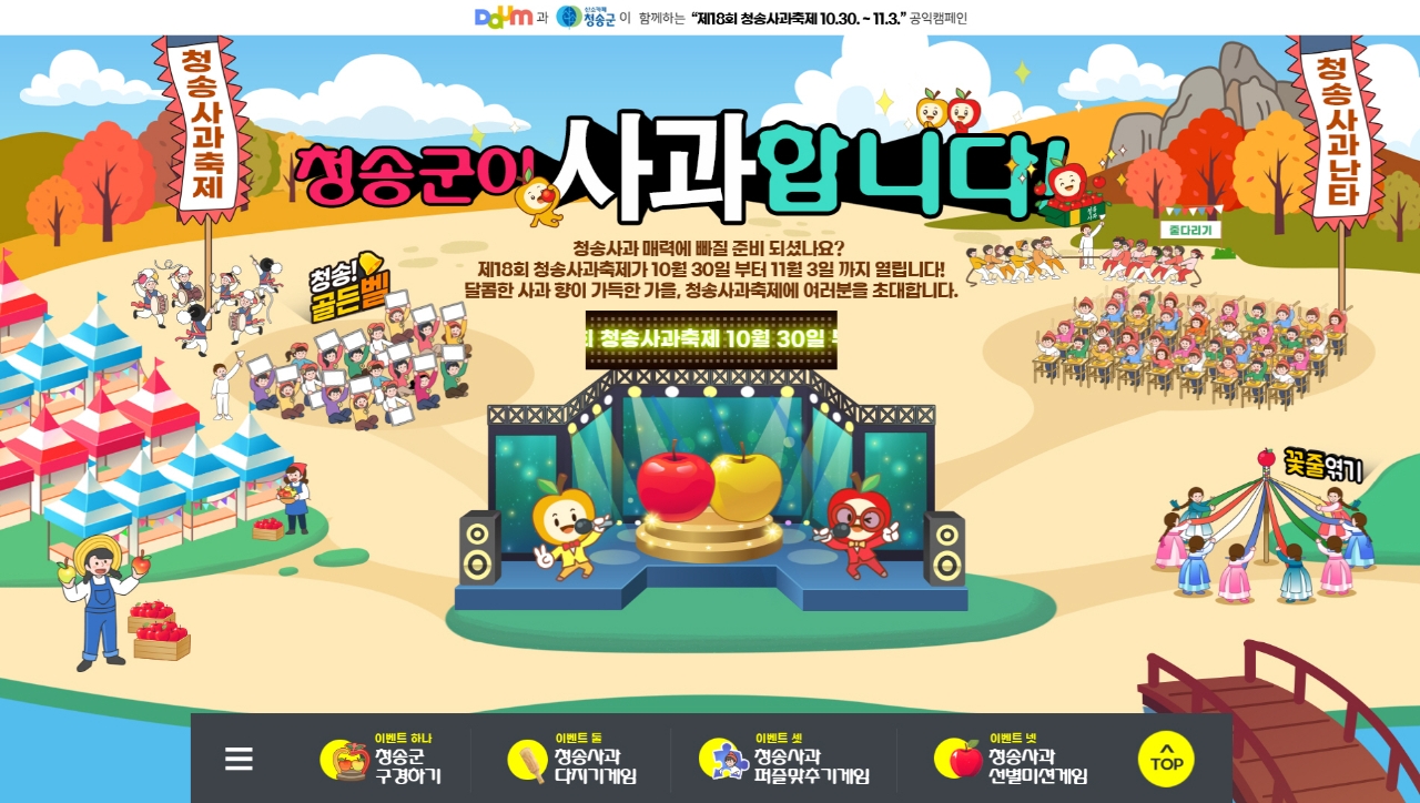 온라인 축제 프로그램은 청송사과축제 홍보와 더불어 대표 킬러 콘텐츠인 꿀잼-사과난타, 도전-사과선별로또를 비롯해 청송투어, 청송퍼즐까지 총 4가지 온라인 게임으로 개발하여 시공간의 제약 없이 남녀노소 즐길 수 있도록 구성했다.