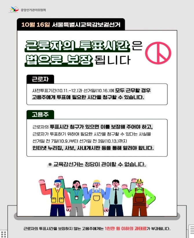 서울시선관위 관계자는 “근로자의 소중한 투표권 행사가 침해되는 일이 없도록 각 기관·단체에서 소속 직원 등의 선거권 행사 보장에 적극 협조해 줄 것을 당부드린다”고 밝혔다.