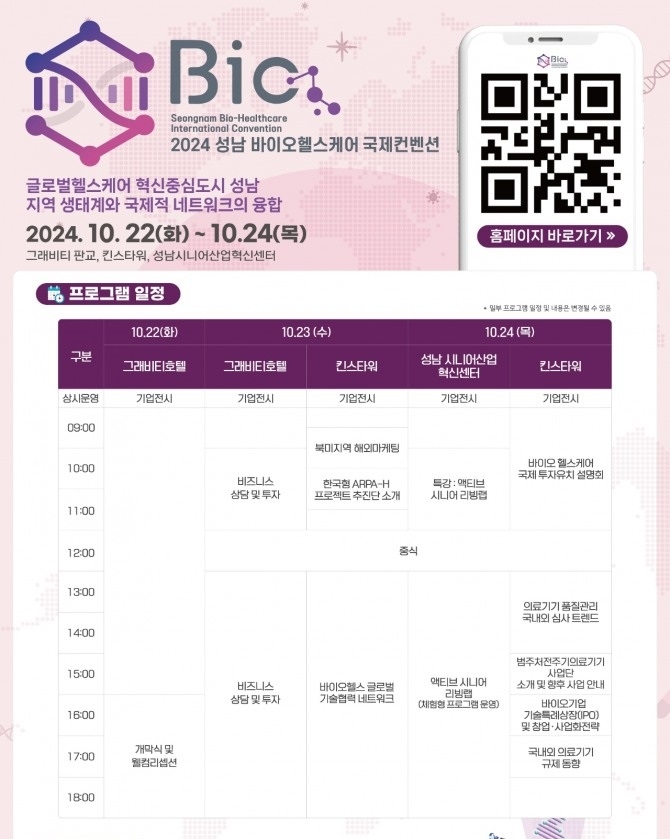 호텔 로비엔 10개 기업이 인공지능 기반 자궁경부암 검진 시스템 등 17개 제품을 전시(22~23일)하고, 호텔 지하 1층 행사장에선 성남의 바이오헬스케어 기업 32개 사와 20개국 50여 명의 바이어가 참여하는 비즈니스 상담 투자 상담회(23일)를 진행한다.