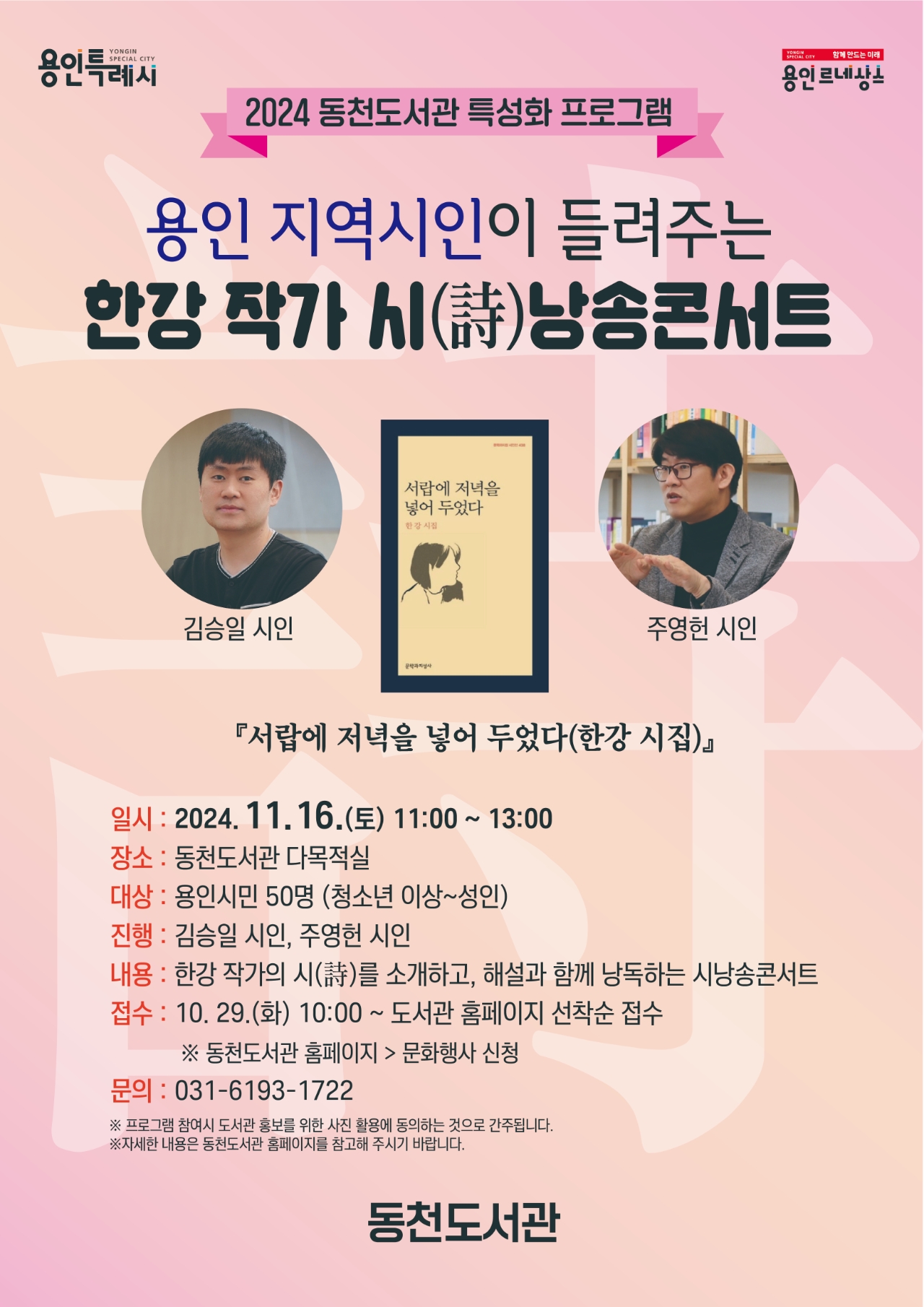 ‘2024 동천도서관 특성화 프로그램’의 일환으로 마련된 이 행사는 오는 11월 16일 오전 11시부터 오후 1시까지 동천도서관 1층 다목적실에서 용인 지역시인이 한강 작가의 시를 낭송한다.