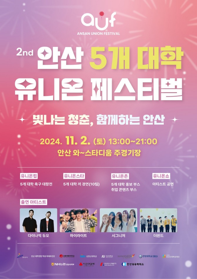 안산시와 대학 연합 학생 축제추진단(이하‘학생 추진단), 관내 5개 대학(△서울예대 △신안산대 △안산대 △한국호텔관광전문학교 △한양대 ERICA) 및 안산인재육성재단의 공동주관으로 개최된다. 축제는 관내 5개 대학의 청년 간 소통과 공감의 장을 마련해 시와 대학이 함께 청년 도시를 구축하자는 취지로 기획됐다. 특히 올해는 기존 학생 추진단뿐만 아니라 각 대학교의 기관장 및 학생팀 실무자 등이 적극적으로 참여해 한층 업그레이드된 축제를 준비했다.
