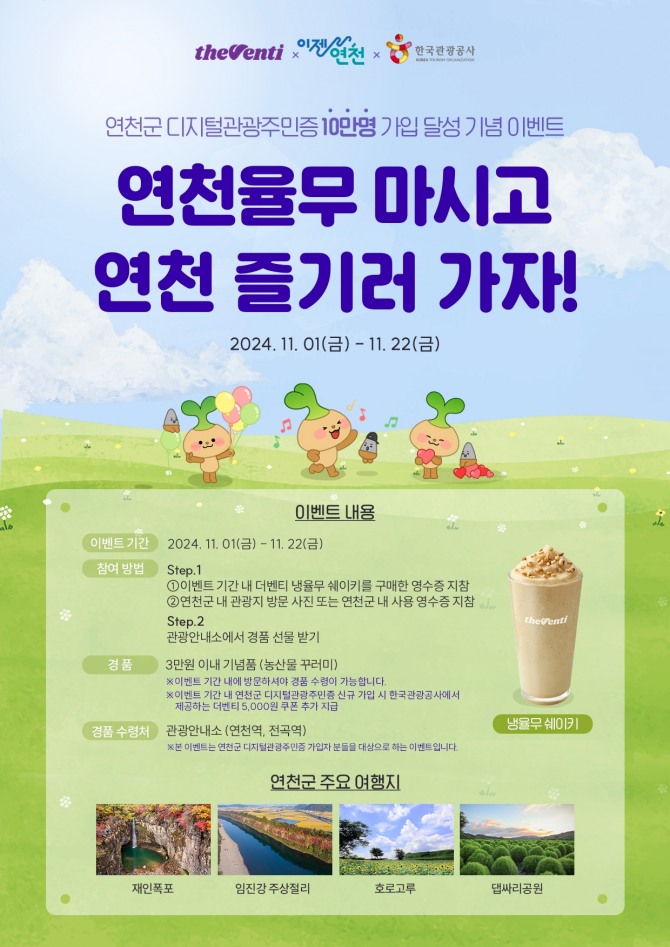 연천군 관광주민증 가입자라면 누구나 참여할 수 있다. 특히, 이벤트 기간 내 신규로 관광주민증을 발급받은 참여자 500명에게는 선착순으로 더벤티 상품권(5천 원권)을 추가로 제공한다.