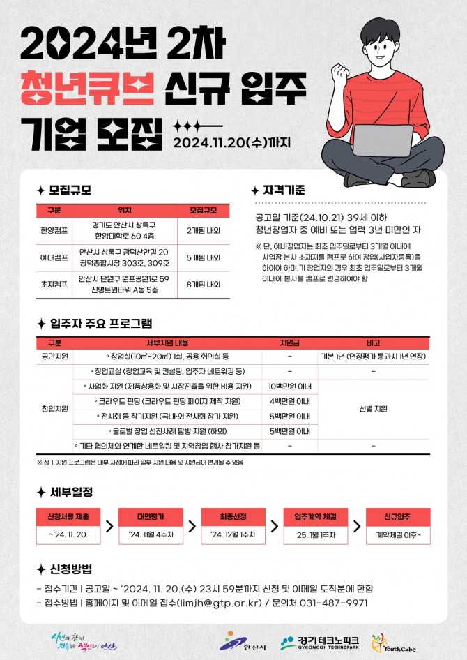 이미지 확대보기모집 대상은 39세 이하 청년창업자 중 예비 또는 업력 3년 미만인 기업이다. 선정 절차는 1차 서류심사와 2차 대면심사로 진행되며, 선정된 기업은 2025년 1월 중 입주할 예정이다. 입주기간은 1년이며, 1년 연장을 통해 최대 2년까지 입주가 가능하다.