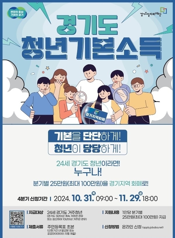 이번 2024년 4분기의 신청대상은 1999년 10월 2일부터 2000년 10월 1일생이다. 경기도에 최근 3년 이상 계속 거주하고 있거나, 합산 10년 이상 거주했다면 청년기본소득을 신청할 수 있다.