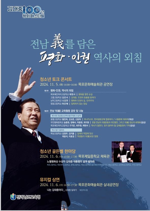 이미지 확대보기전라남도교육청(교육감 김대중)은 11월 5~6일 목포문화예술회관 등에서 김대중 전 대통령 탄생 100주년을 기념한 ‘김대중 100년 평화 페스티벌:청소년 평화·인권 문화축제’를 개최한다.