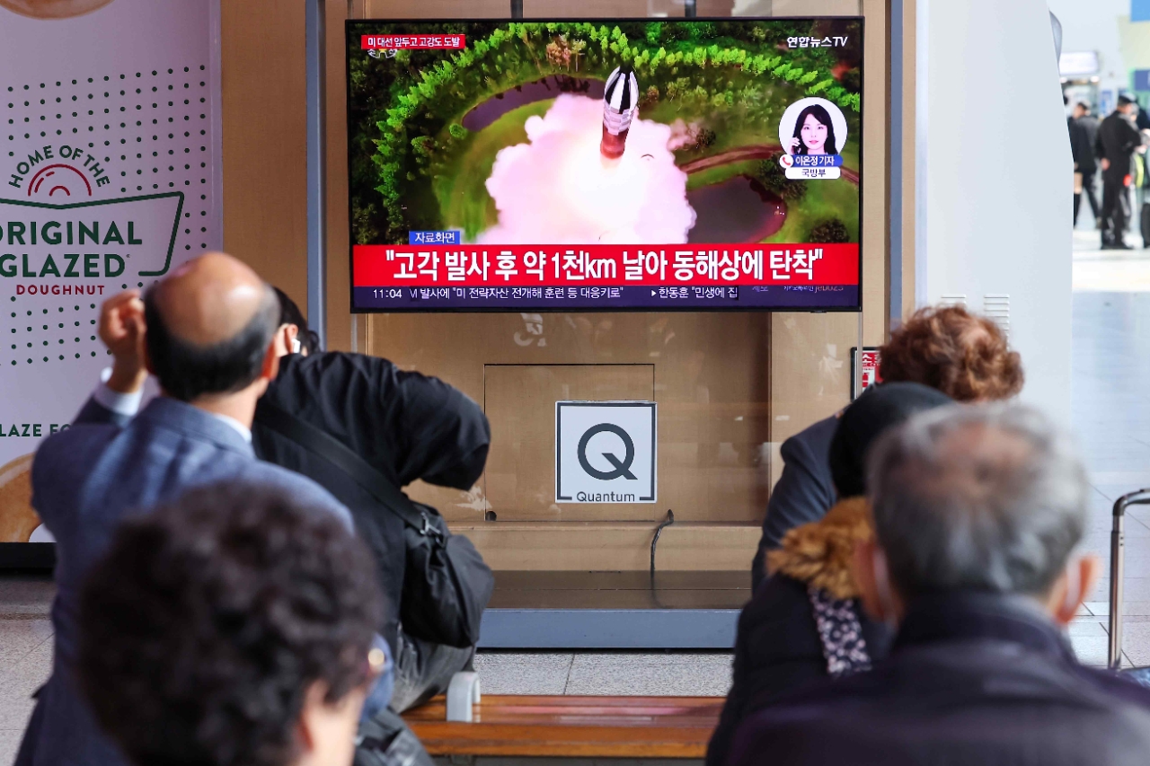 이미지 확대보기북한이 동해상으로 신형 대륙간탄도미사일(ICBM)을 발사한 31일 오전 서울역 대합실에서 시민들이 관련 방송뉴스를 지켜보고 있다. 합동참모본부에 따르면 북한이 31일 오전 평양 일대에서 고각으로 발사한 ICBM은 1천㎞를 비행한 뒤 동해상에 탄착했다. 사진=연합뉴스.