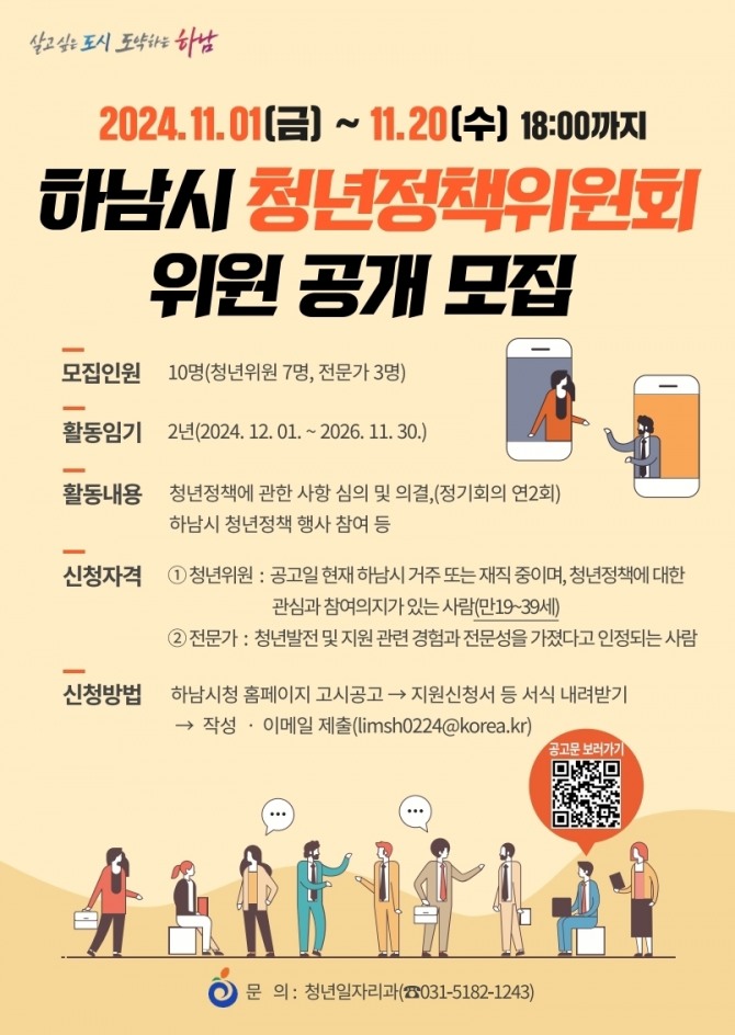 청년위원(7명)은 하남시에 거주 또는 재직 중인 자로 청년정책에 적극적으로 참여할 의사나 관련 경험이 있는 청년(만 19세 이상 39세 이하)이, 청년정책전문가(3명)는 분야별 청년 정책 관련해 학식과 경험이 풍부한 자가 지원 가능하다.