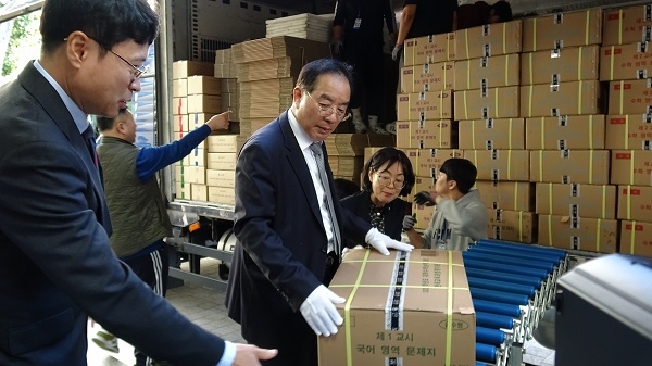 이미지 확대보기하 교육감은 11일 오후 3시 부산 동래중학교을 직접 찾아 수능문답지 인수에 직접 참여하고, 시험장학교 현장 점검 후 담당자들을 격려했다.