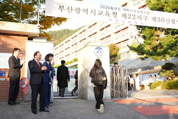 하윤수 부산광역시교육감이 14일 오전 7시 20분 동래구 사직고등학교에서 2025학년도 대학수학능력시험을 치르는 수험생들을 격려하고 있다. 2025학년도 수능은 전국 52만 2670명이 지원했으며, 부산은 58개 시험장에서 2만 7356명이 응시한다. 수능 한파는 없으며 오후에는 빗방울이 떨어지는 곳이 있다는 예보다.