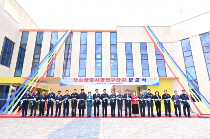 이미지 확대보기청송군은 13일 윤경희 청송군수를 비롯해 심상휴 청송군의회의장, 신효광 도의원, 임기진 도의원, 청송군의회, 경상북도농업기술원 원민정 농촌지도국장, 국립원예특작과학원 이동혁 사과연구센터장 등이 참석한 가운데 '청송황금사과 연구단지' 준공식을 개최했다.