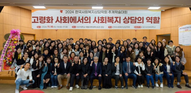 대구사이버대학교 사회복지상담학과(학과장 송인욱)는 지난 16일 사회복지상담학과 재학생 및 동문 50여 명과 학회 회원 등이 참석한 가운데 대구대학교 재활과학대 강당에서 추계학술대회를 개최해 고령화사회에 대처하는 사회복지 상담의 역할과 기능에 대해 지혜를 모았다.