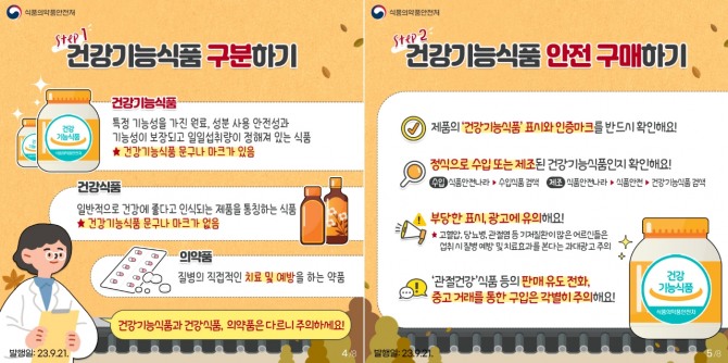 이미지 확대보기이번 활동은 사전심의 받지 않은 건강기능식품을 불법 판매하거나 허위·과대광고로 어르신들의 피해를 예방하고자 추진되며 주요 홍보 내용은 △질병의 예방·치료에 효능·효과가 있다고 하는 경우 등 ‘건강기능식품의 부당광고’ △건강기능식품 표시 여부 등 ‘건강기능식품 구매 시 주의 사항’ 등이다.