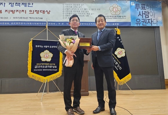 이미지 확대보기한국유권자중앙회가 2024년 한 해 동안 지방자치 의정 활동을 통해 지방자치 발전과 국가발전에 크게 기여한 공로가 큰 개인 또는 단체에 수여하는 상으로, 이날 시상식은 국회의사당 국회의원회관에서 진행됐다.