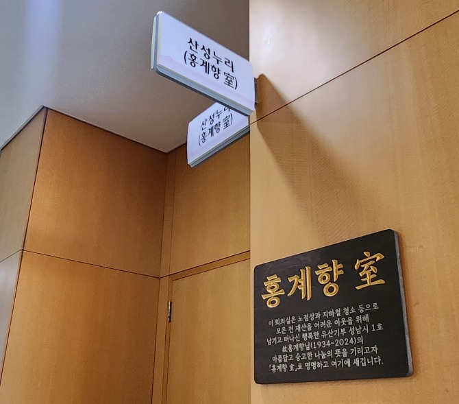 26일 시는 기부자에 관한 예우와 나눔 문화를 확산하기 위해 시청 3층 산성누리 회의실 이름을 ‘홍계향 室(실)’로 바꾸고 현판식도 진행했다.