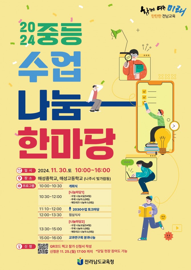 2030수업 토크마당에서는 ‘2030수업지원단’이 주도해 전남교육의 수업 대전환의 방향성과 실천 방안을 이야기한다. 교육감, 신규 교사, 교과교육연구회 대표 등이 참여해 2030수업에 대해 함께 고민하는 자리가 될 전망이다.
