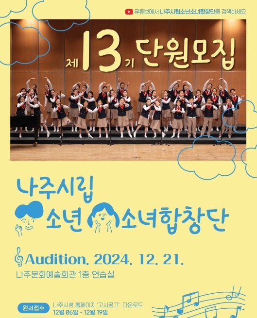 전라남도 나주시(시장 윤병태)는 나주시립소년소녀합창단의 제13기 단원을 모집한다고 3일 밝혔다.이번 모집은 12월 6일부터 12월 19일까지 진행되며 나주의 어린이와 청소년들이 음악적 재능을 발휘하고 예술적 성장을 도모할 수 있는 기회를 제공한다.