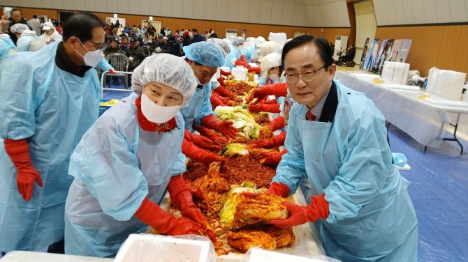 이날 행사에는 서명옥 국회의원, 김형재 서울시의원을 비롯해 강남구의회 이호귀 의장, 트로트 가수 박지현 팬카페 회원 200여명, 봉은사 차문화연구소 임원진, 한국기능장애인협회 임직원 및 지역주민 등 300여 명의 자원 봉사자들이 참여해 김장 김치 1200포기를 담아 포장했다.