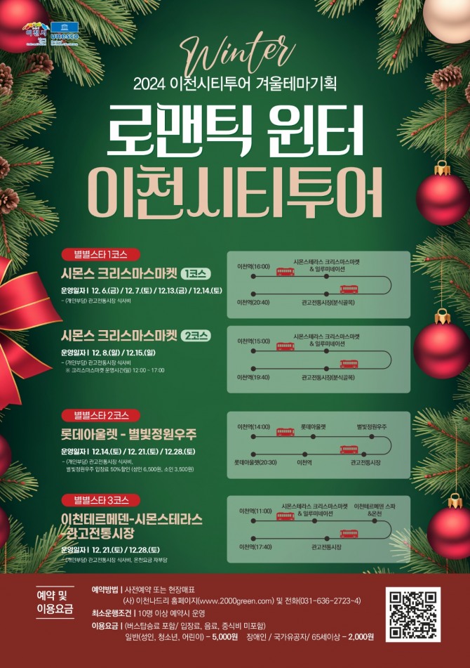 이번 시티투어는 이천에서 즐기는 로맨틱한 겨울을 주제로 관광객에게 겨울 감성을 충분히 느낄 수 있는 코스로 준비해 오는 6일부터 28일까지 운영된다.