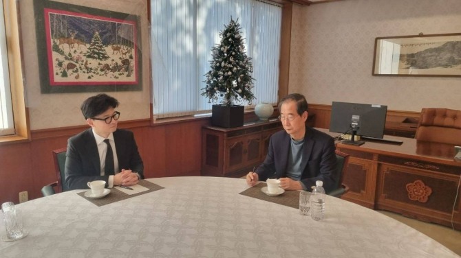 한 대표는 지난 7일 윤 대통령 탄핵소추안이 '투표 불성립'으로 폐기된 뒤 국회에서 "혼란을 최소화하기 위해 대통령의 질서 있는 퇴진을 추진할 것이다. 대통령은 퇴진 시까지 사실상 직무 배제될 것이고 국무총리가 당과 협의해 국정운영을 차질 없이 챙길 것"이라고 말했다.