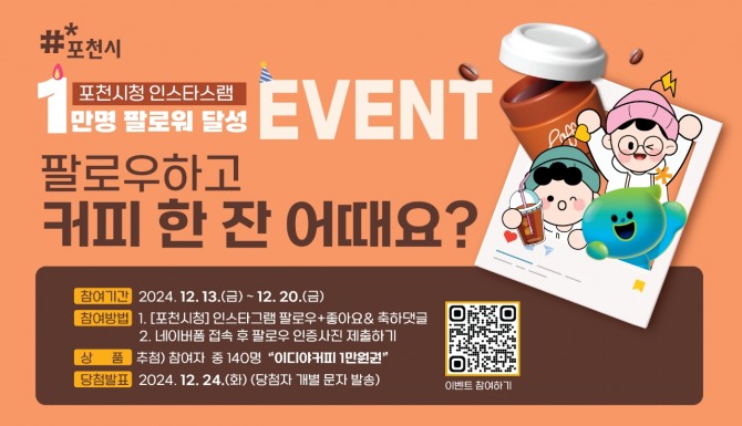 이번 이벤트는 시민의 관심에 보답하고, 시민과의 소통을 위해 마련됐다. 이벤트 참여는 포천시청 인스타그램 계정을 팔로우한 후, 팔로우 화면을 캡처해 네이버폼 링크에 등록하면 된다. 이벤트 게시글에 ‘좋아요’와 댓글 작성도 필수다. 당첨자는 오늘 24일 발표된다.