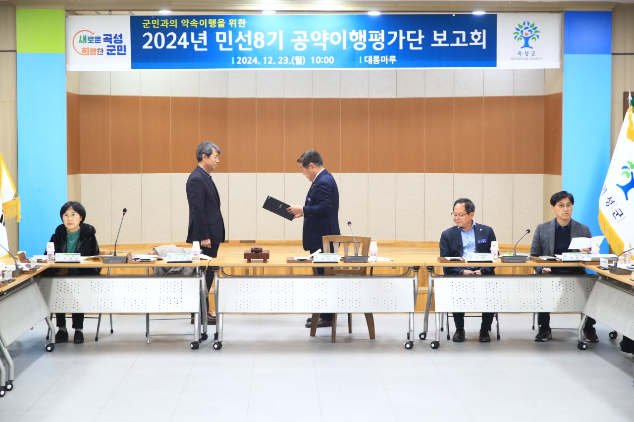 조상래 곡성군수는 “군민과의 약속을 함게 실현해 나가는 과정에 동참해 주신 평가단에 감사드린다.”며 “민선 8기의 군정 목표인 ‘새로운 곡성, 희망찬 군민’을 달성하기 위한 5대 분야 공약을 철저히 이행해 군민에게 자부심과 희망을 드리겠다.”고 말했다.