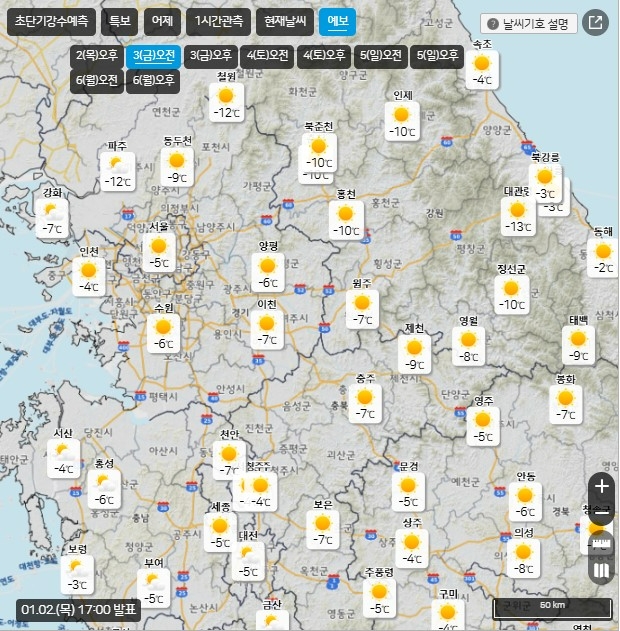 3일 오전 최저기온은 -13∼0도, 낮 최고기온은 1∼7도로 예보됐다. 강원도 대관령 -13도, 철원·파주 -12도, 춘천·홍천·인제·정선군 -10도, 동두천·태백이 -9도로 예상된다.
