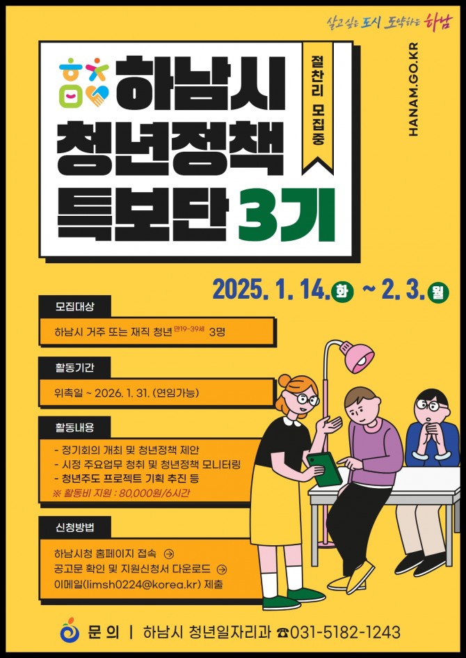 이번에 모집하는 인원은 정책특보 3명으로, 하남시에 거주하거나 재직 중인 19~39세 청년이면 누구나 지원할 수 있다. 지원을 희망하는 청년은 지원 신청서를 작성해 이메일로 제출하면 된다.