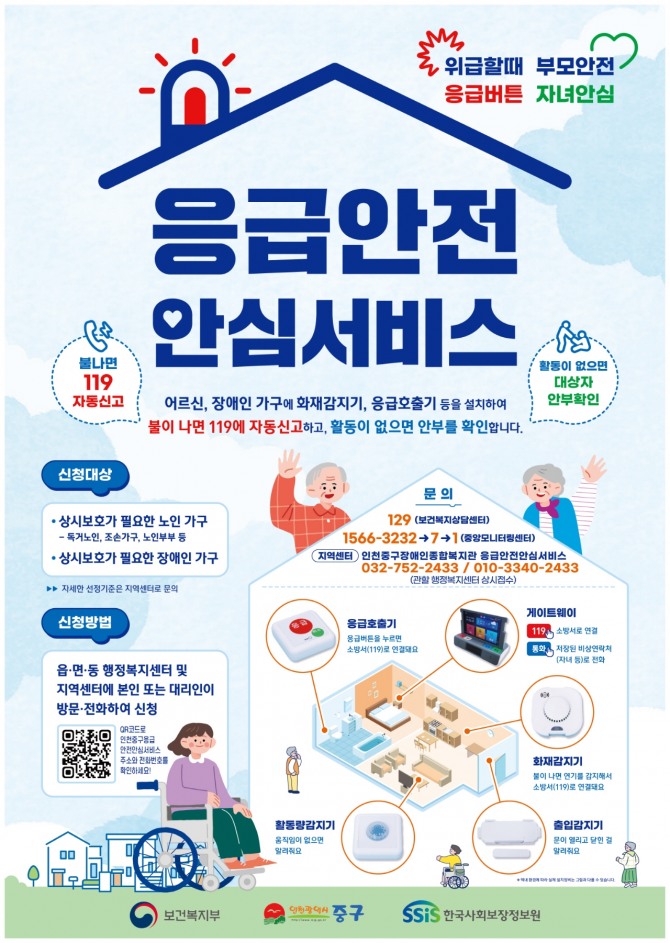 이미지 확대보기보건복지부와 인천 중구 등이 함께하는 응급안전안심서비스는 노인과 장애인 가정 내 정보통신기술(IoT) 기반의 장비를 설치해 응급상황 발생 시 119에 신속히 알려 구급·구조를 지원하는 사업이다.