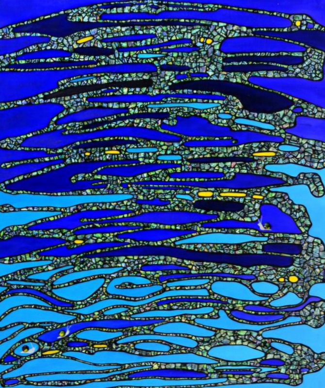 우리네 삶이란 느릿하게 길게 천천히 다가온다. 날씨와 상황에 따라 삶의 이치를 헤아리며 끈기있게 버티면서 적응해야 한다. 고열에서 구워진 칠보의 등껍질이 물감에 녹으면서 그림에 달라붙는다. 기암괴석 같은 형상이 투영된 작품은 힘들고 어려울 때 작가를 응원하는 희망의 메시지이다. 작가는 희망의 색깔로 Blue에서 Black을 아우른다.
