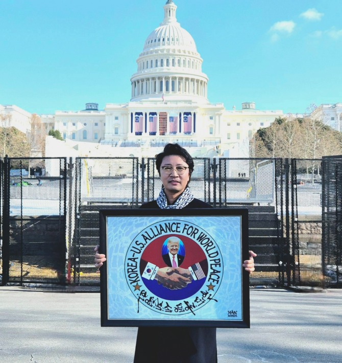 한 작가는 “미국 47대 트럼프 대통령 취임을 축하드린다. 이번 트럼프 대통령의 역할은 국제사회에 있어서 그 어느 때보다 중요하다”며 “특히 가장 평화가 절실하고, 가장 어려운 시련을 격고 있는 대한민국뿐만 아니라, 세계평화에도 지대한 영향을 미칠 것이라 믿고 '한미동맹 세계평화' 작품을 전달하기 위해 미국을 방문했다"고 말했다.