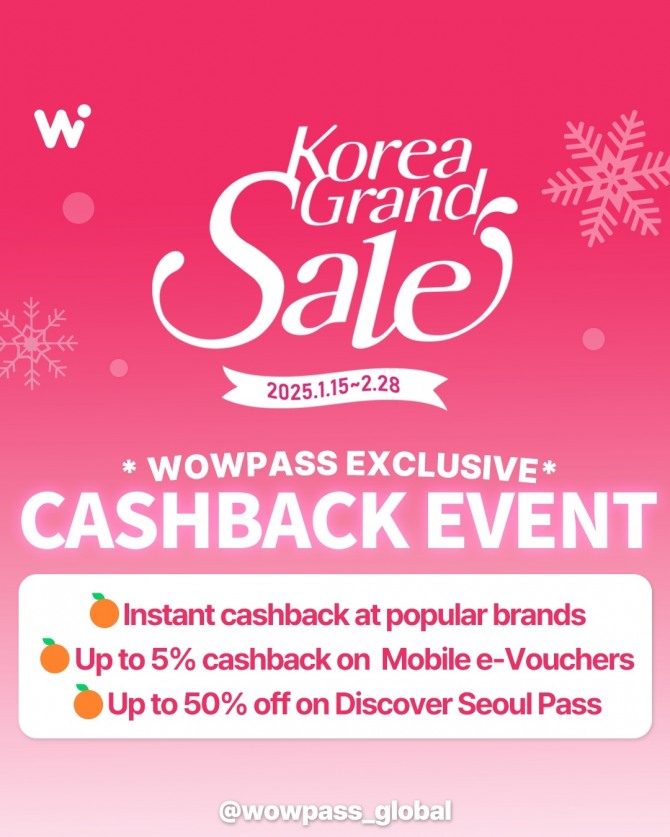 이미지 확대보기방한 외국인 전용 올인원(결제·환전·교통카드) 선불카드 ‘와우패스(WOWPASS)’를 운영하는 오렌지스퀘어(대표 이장백)는 ‘2025 코리아그랜드세일’에 참여해 외국인 관광객을 대상으로 와우패스 잔액, 캐시백, 공항패키지 등 특별 혜택을 제공한다고 16일 밝혔다.