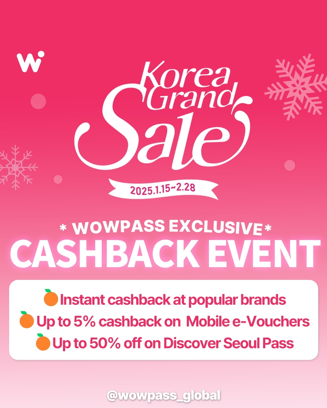 다양한 경품을 제공하는 이번 코리아그랜드세일 이벤트는 와우패스 소셜 미디어에서 자유롭게 응모할 수 있다. 오렌지스퀘어는 외국인 관광객의 소비 심리를 자극하는 것은 물론 내수 진작에 기여하고자 자체 운영 중인 일본, 중화권, 중국, 글로벌 소셜 미디어 채널에서 코리아그랜드세일 콘텐츠를 제공하고 있다. 와우패스 앱 내에선 코리아그랜드세일 페이지도 운영 중이다.