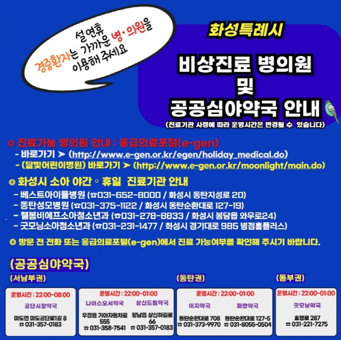 또한 시민들이 편리하게 의료기관을 찾을 수 있도록 연휴기간 운영하는 병·의원과 약국 정보를 화성시 보건소 홈페이지와 SNS, 문자메시지 안내를 통해 제공한다.