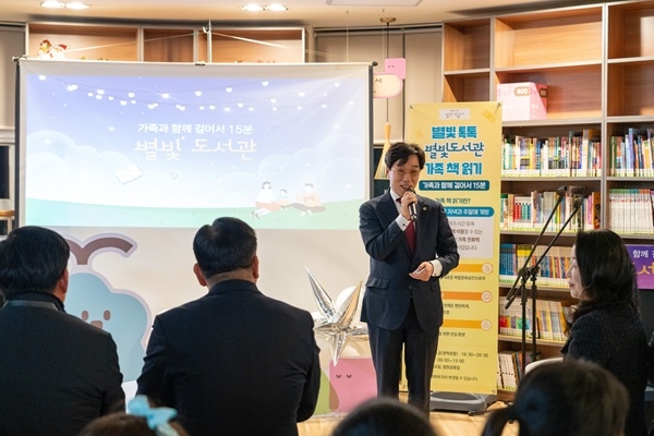 최윤홍 부산광역시교육감 권한대행이 4일 오후 7시 기장군 소재 일광초등학교 별빛 도서관 개관식에 참석해 응원 메시지를 전하고 있다. 부산 기장군 일광초 별빛 도서관은 보수초(서구), 해강초(해운대구)에 이어 3번째로 개관하는 별빛 도서관이다. 부산시교육청은 올해 안에 20곳의 별빛 도서관을 개관한다는 계획이다.