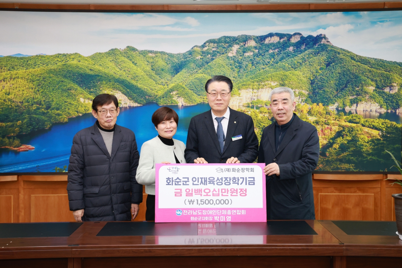 이미지 확대보기(재)화순장학회(이사장 : 구복규 화순군수)는 지난 4일 전라남도장애인단체총연합회 화순군지회가 지역 학생들의 학업을 지원하기 위해 장학금 150만 원을 기부했다고 밝혔다.