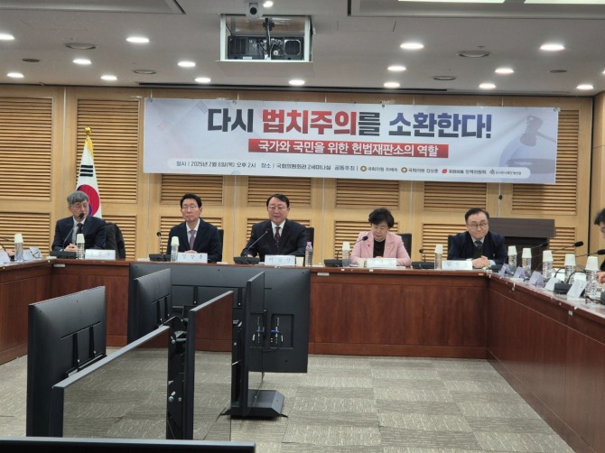 이미지 확대보기이번 토론회는 국회의원 조배숙, 김상훈 의원과 국민의힘 정책위원회, 범시민사회단체연합(이하 범사련)이 공동 주최했다. 법조계 및 학계 전문가들이 참석해 법치주의의 현주소와 헌법재판소의 역할에 대해 심도 있는 논의를 했다.
