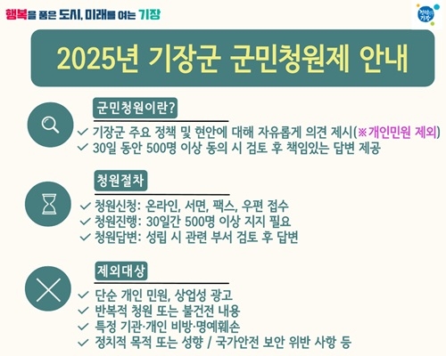 정종복 기장군수는 “군민청원제를 통해 군민들이 지역 정책과 현안에 대해 보다 쉽게 목소리를 내면서, 군정에 대한 참여와 소통이 활성화될 것으로 기대한다”고 말했다.