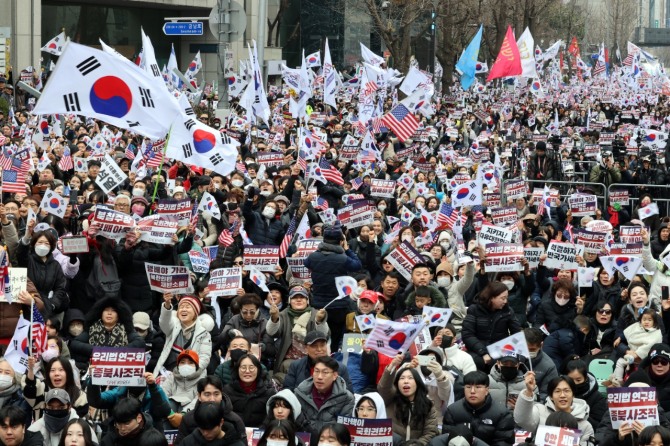 참석자들은 '대통령을 석방하라'거나 '부정선거 검증하라' 등의 문구가 적힌 손팻말을 들고 연단에 오른 발언자의 목소리에 귀를 기울였다.