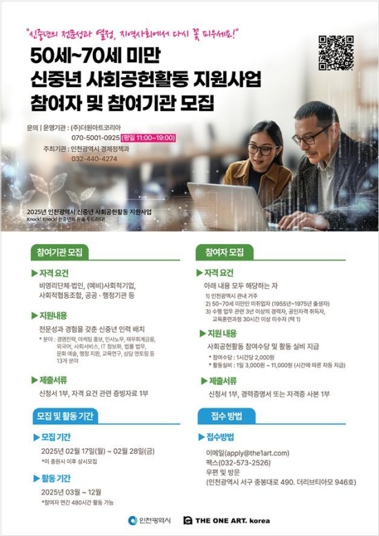 특히 참여자 자격은 50세 이상 70세 미만의 인천시민 중 해당 활동 분야에서 3년 이상의 경력을 보유하거나 관련 공인자격을 가진 미취업자이다.