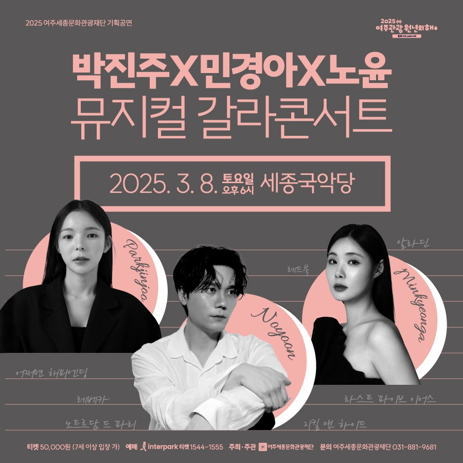 이미지 확대보기‘박진주, 민경아, 노윤의 뮤지컬 갈라 콘서트’는 여주시민들의 수요가 가장 많은 공연 장르인 뮤지컬을 공연장 사이즈의 한계로 전막으로 선보일 수 없어 갈라 형식으로 구성, 유명 뮤지컬 넘버들을 선보여 시민들에게 뮤지컬 전용 공연장 못지않은 감동을 선물하고자 기획한 공연이다.