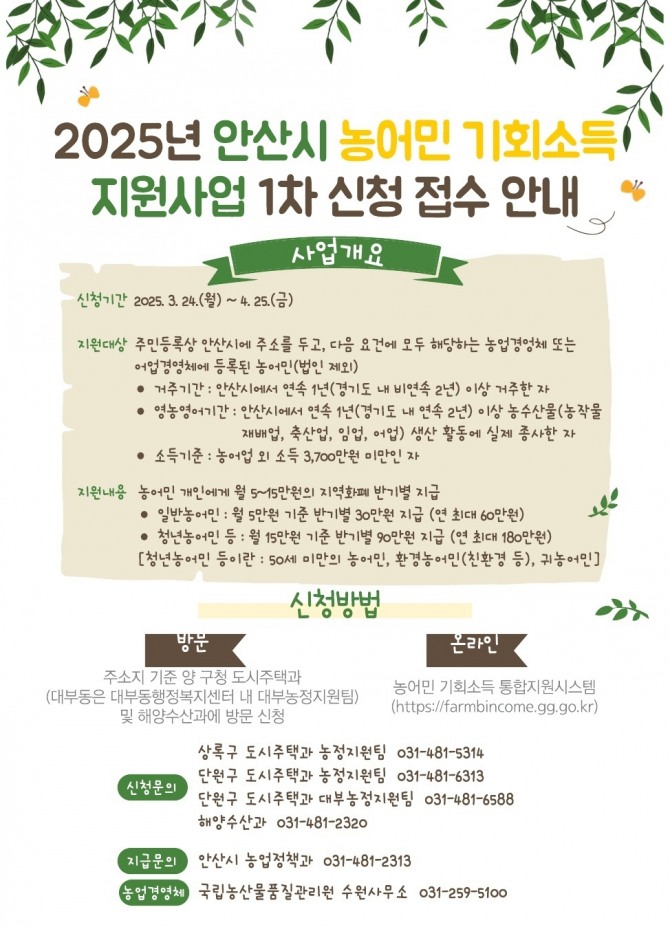 신청을 원하는 시민은 오는 4월 25일까지 주소지 기준 구청 도시주택과 농정지원팀(대부동은 대부농정지원팀)과 대부해양본부 해양수산과에 방문해서 접수하거나 경기도 농어민 기회소득 통합지원시스템 누리집에서 온라인으로 신청할 수 있다.