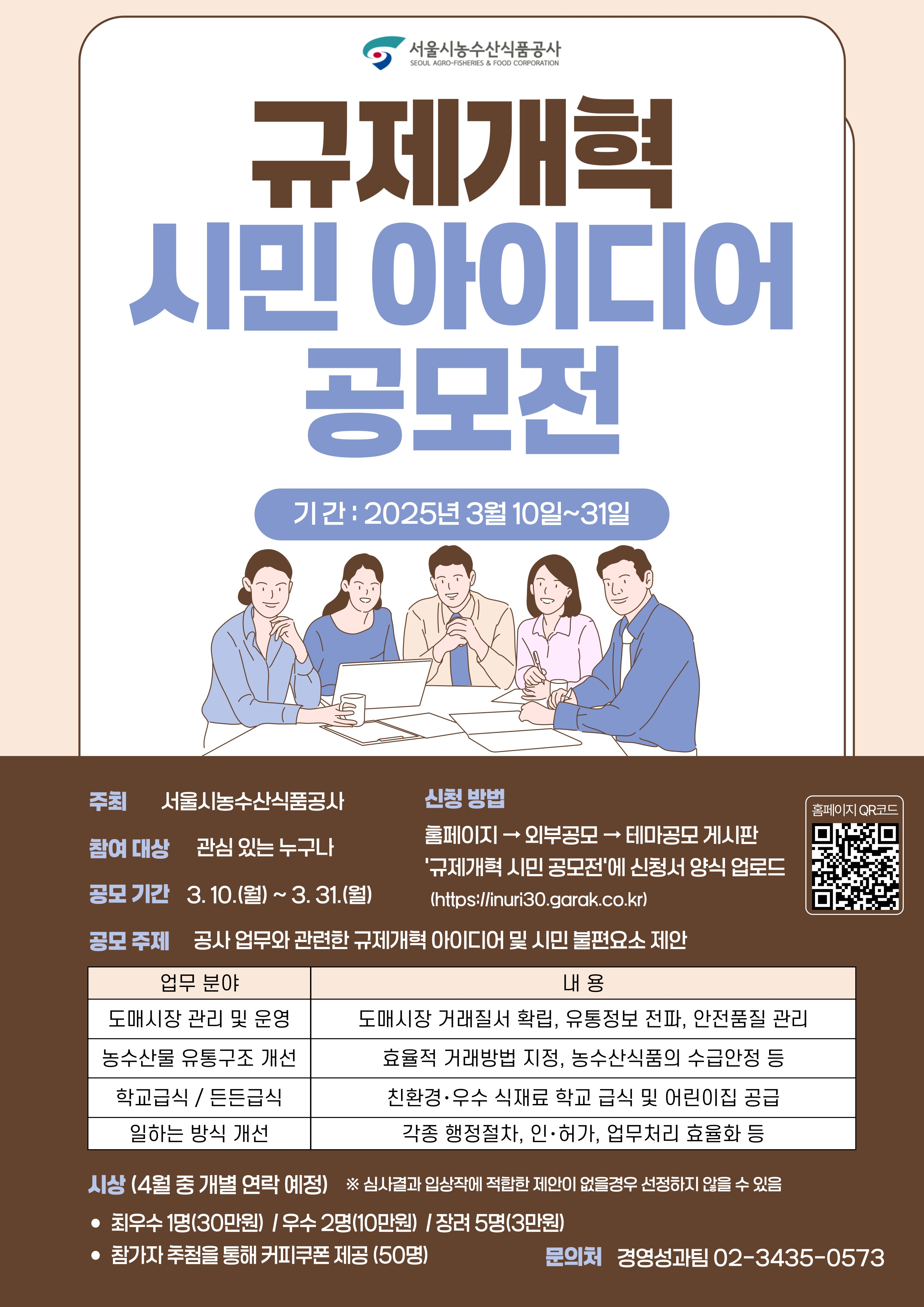 이미지 확대보기공사는 국민들의 생생한 의견을 통해 낡고 불합리한 규제를 개선해 새로운 유통환경에 걸맞은 도매시장으로 새로운 도약의 기회를 만들고, 소상공인 및 협력사 등과의 상생 발전 및 지역경제 활성화를 위해 이번‘규제개혁 아이디어 시민공모전’을 개최한다고 밝혔다.