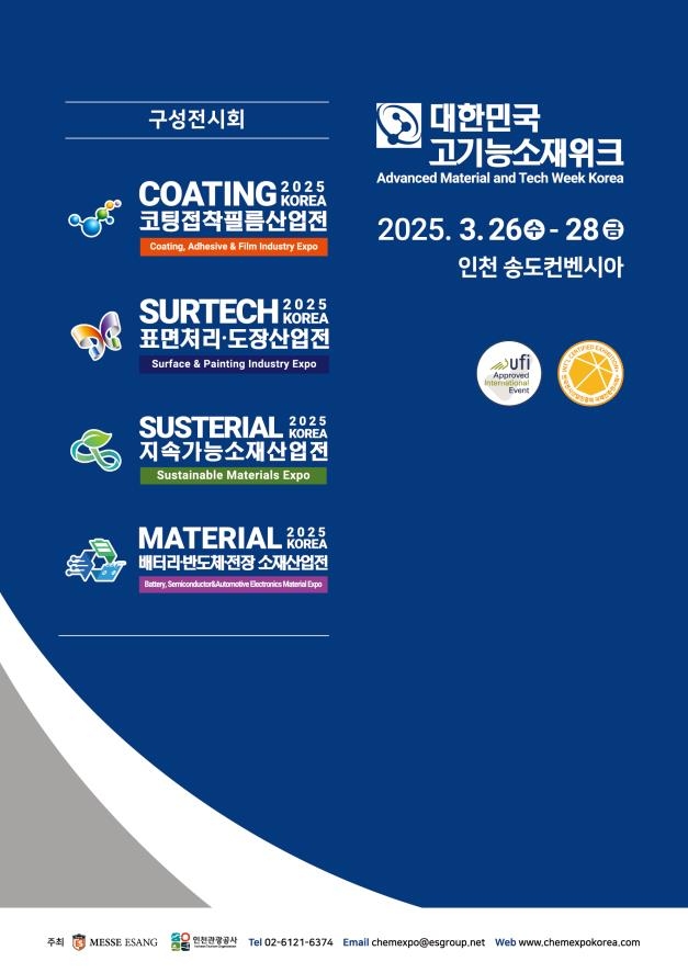 이미지 확대보기올해 16회째를 맞는 ‘대한민국 고기능소재위크’는 △코팅접착필름산업전 △표면처리산업전 △지속가능소재산업전 △배터리·반도체·전장소재산업전 등 총 4개 전시회로 구성된 제조 산업 전반을 아우르는 소부장(소재·부품·장비) 특화 박람회이다.
