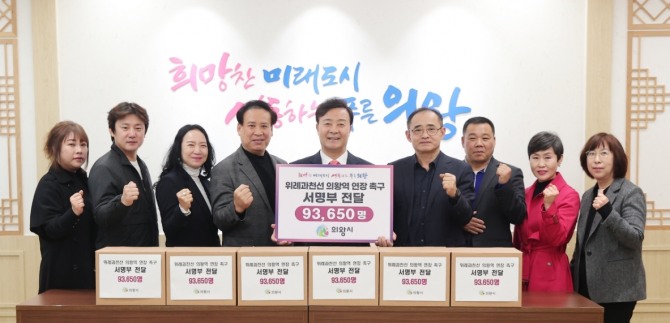 이미지 확대보기의왕시 주민자치위원협의회는 지난 2월 부터 한 달간 의왕시민과 각 시민단체, 관내 기업체 종사자를 대상으로 서명운동을 전개해 총 93,650명의 서명을 받았다.
