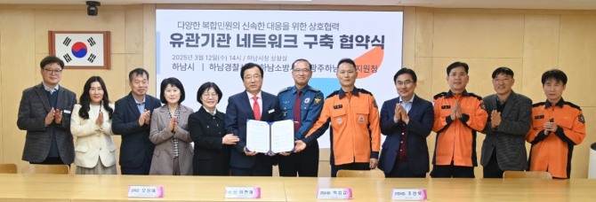 이미지 확대보기이현재 하남시장은 지난 12일 시청 상황실에서 박성갑 하남경찰서장, 조천묵 하남소방서장, 오성애 광주하남교육지원청 교육장과 함께 복합민원의 신속한 대응을 위한 상호협력 네트워크 구축 업무협약을 체결했다.