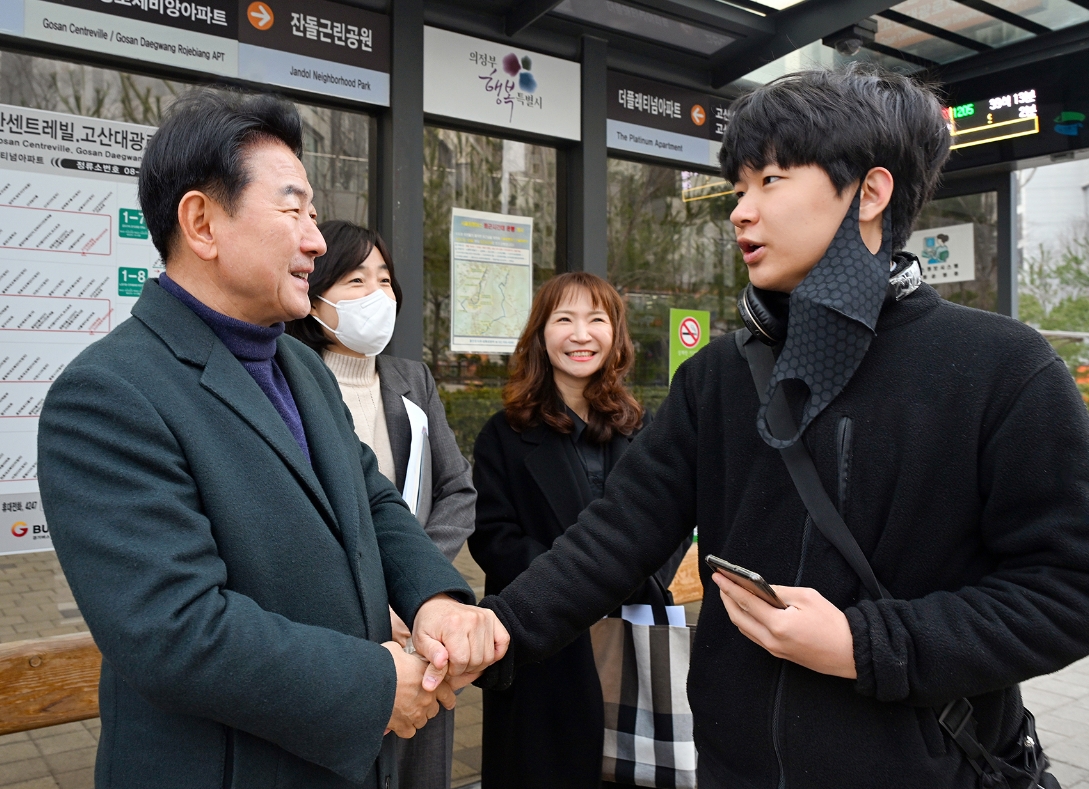 김동근 시장은 이날 고산센트레빌 정류소에서 학생 01-A번 버스를 기다리는 학생들과 인사를 나누고 이용 현황을 살폈다. 이후 의정부시 최초로 도입된 수소버스에 탑승해 학생들과 직접 대화를 나누며 통학버스에 대한 의견을 청취하고, 불편 사항을 점검했다.