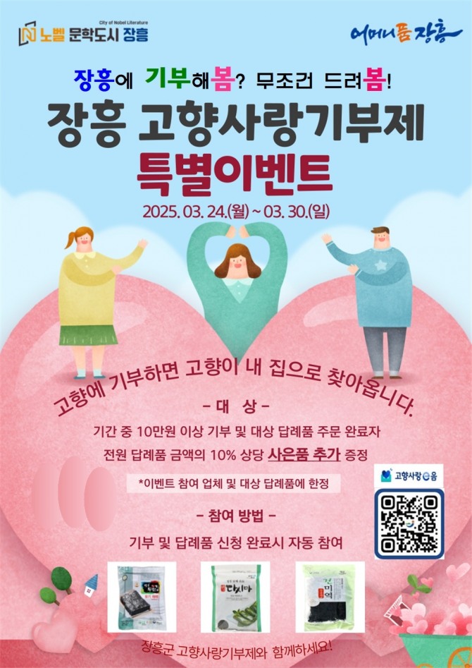 이번 행사는 3월 24일(월)부터 3월 30일(일)까지 7일간 진행되며 기간 중 장흥군에 고향사랑기부 후 답례품을 주문한 사람을 대상으로 구매금액의 10%에 상당하는 특산품을 추가로 증정한다.