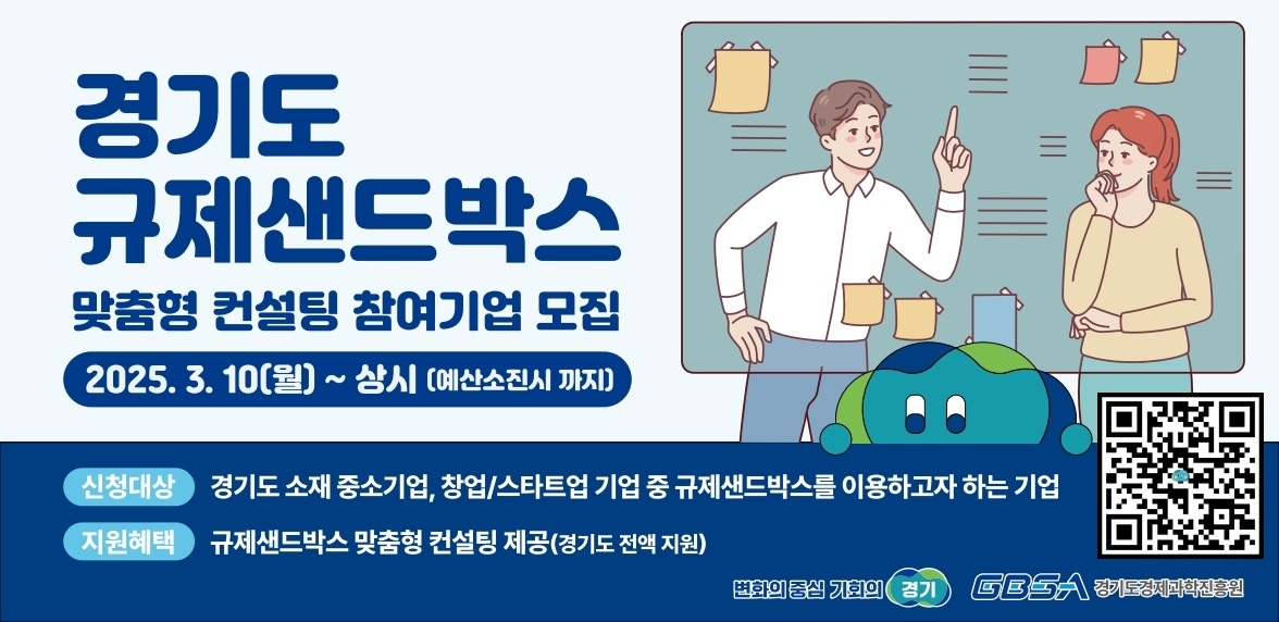 대상은 규제샌드박스를 통해 실증특례나 임시허가를 받은 중소기업과 스타트업 10개사이며, 오는 28일까지 경기R&D과제관리시스템을 통해 신청하면 된다.